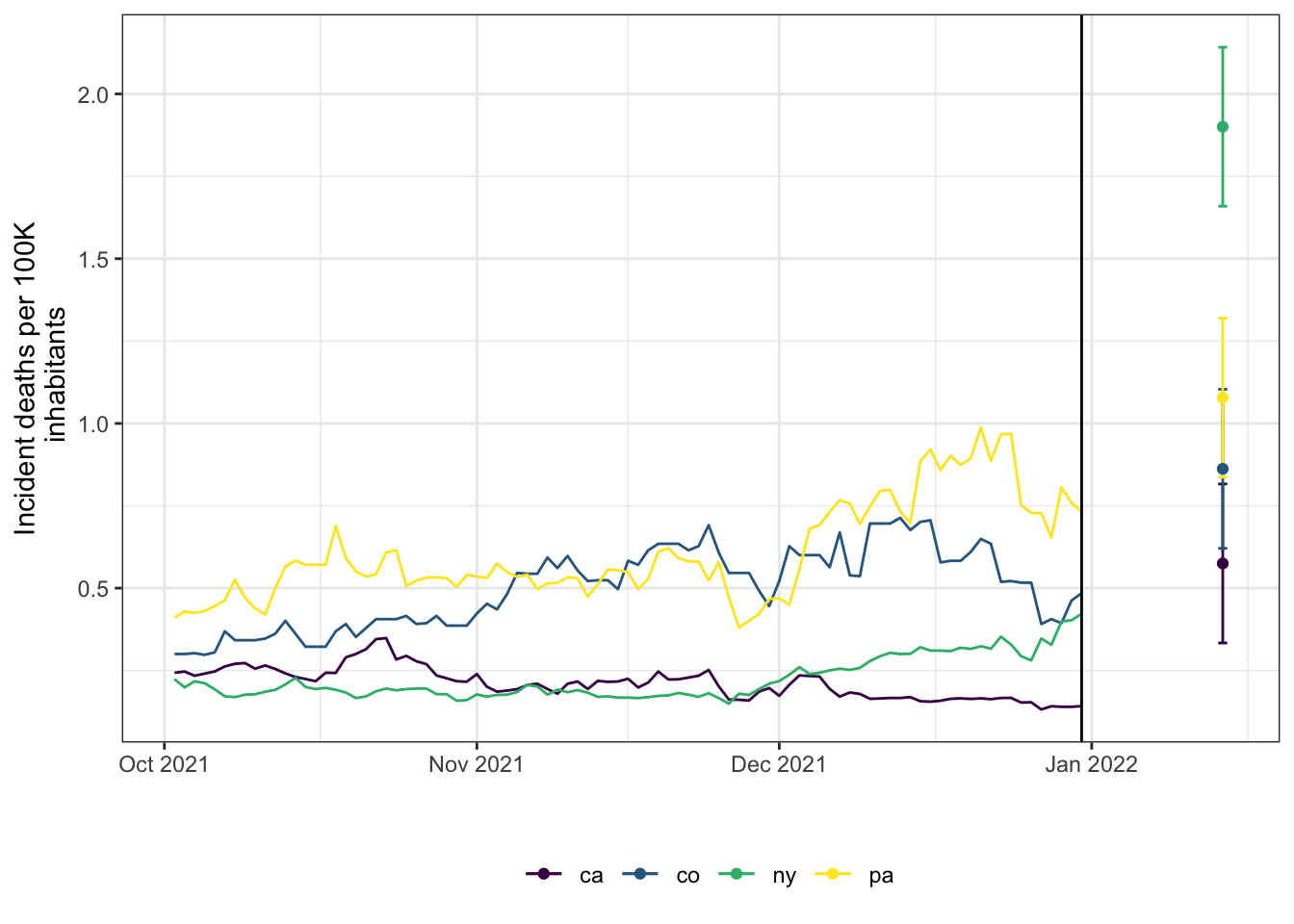 displays the forecast for a small handful of states. The vertical black line is the forecast date. The forecast doesn’t appear to be particularly good, but our choices above were intended to be illustrative of the functionality rather than optimized for accuracy.