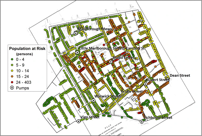 John Snow (1855) - cholera epidemic in London tied to a water pump