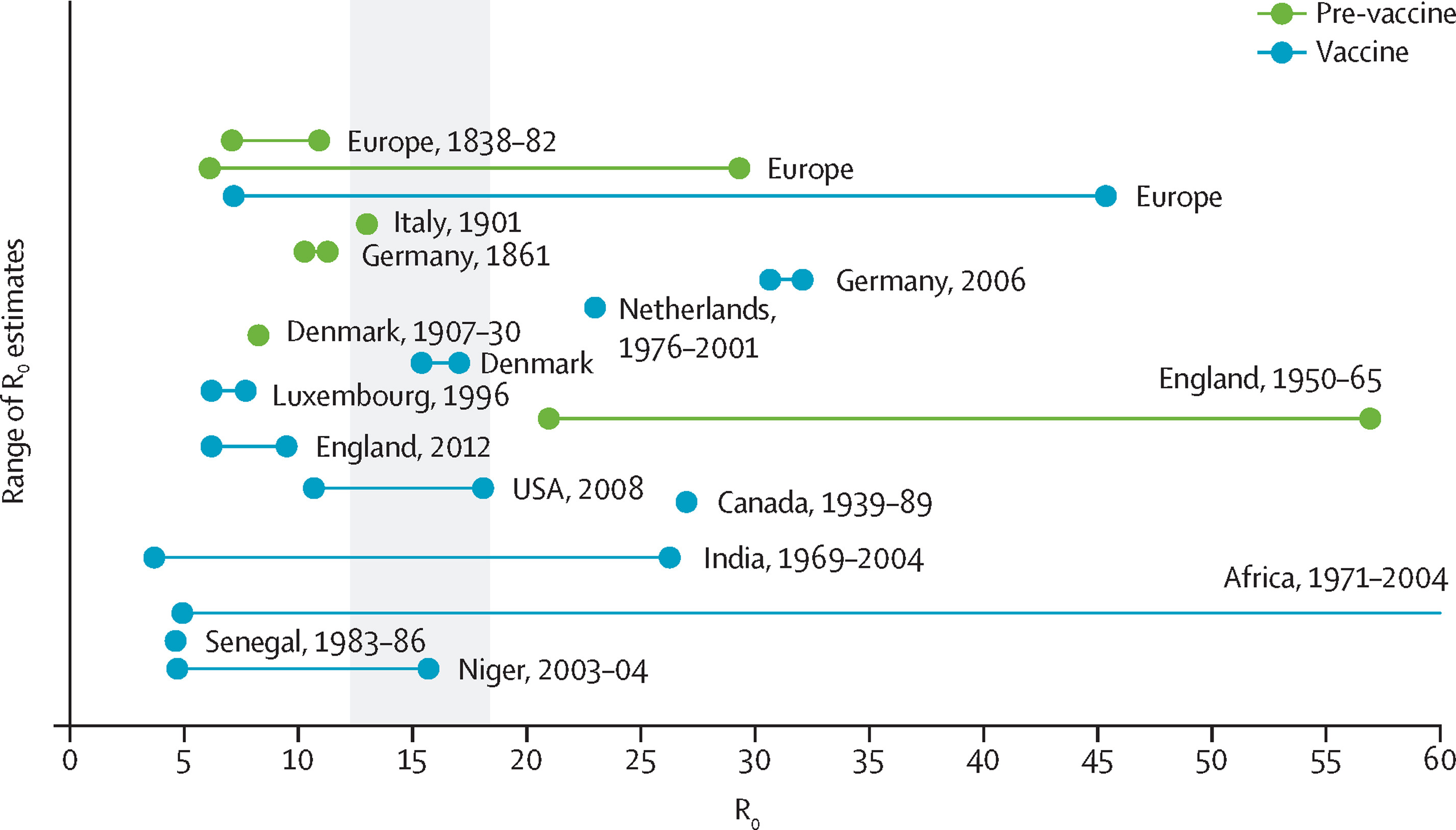 So, for measles, if \(R_0\approx 15\), the disease will die out if immunity is